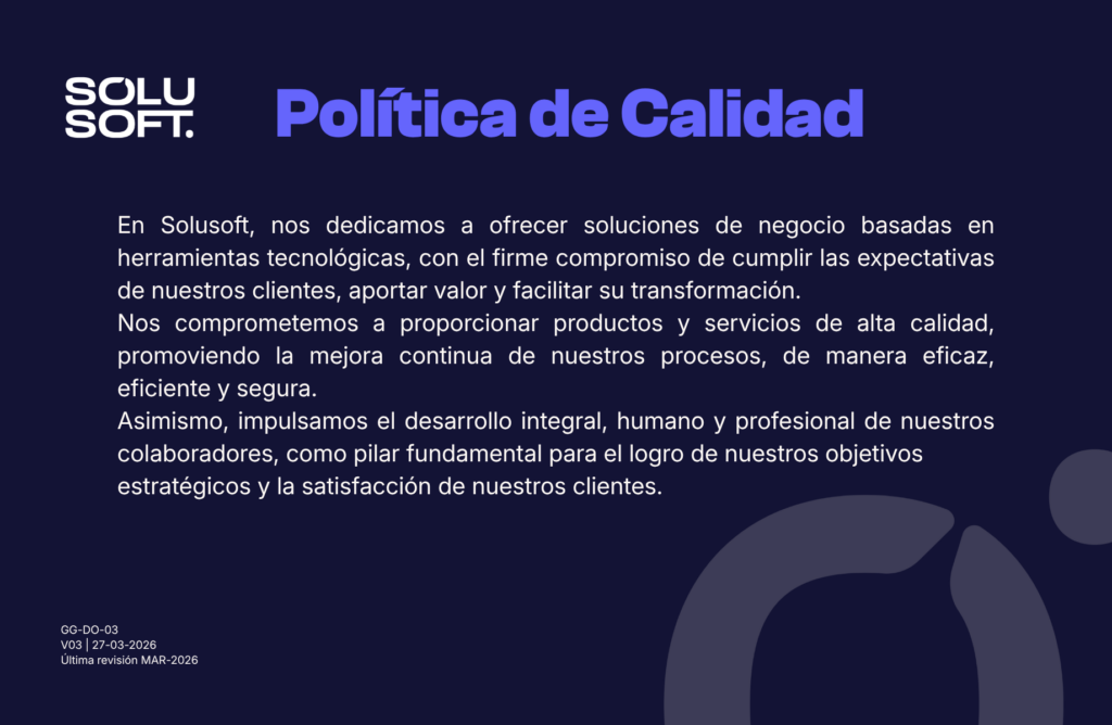 La información que genera y gestiona “SOLUSOFT”, constituye un activo estratégico clave para asegurar la continuidad del negocio. En este contexto, la Política de Seguridad de la Información está orientada a proteger: la información en la totalidad de su ciclo de vida (creación, difusión, modificación, almacenamiento, preservación y eliminación), los medios que permiten dicho ciclo y las personas que acceden a la información y/o la manipulan. Lo anterior, con el fin de garantizar su integridad, disponibilidad y confidencialidad.
